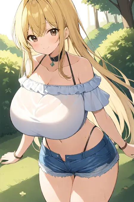 denim shorts, bare shoulders, off shoulder, crop top, white shirt, midriff, frilled shirt, collarbone, cutoffs