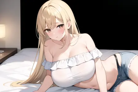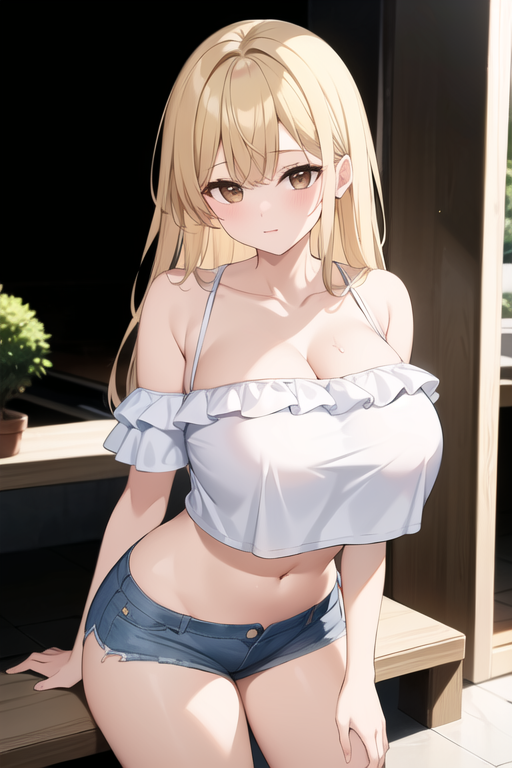 denim shorts, bare shoulders, off shoulder, crop top, white shirt, midriff, frilled shirt, collarbone, cutoffs
