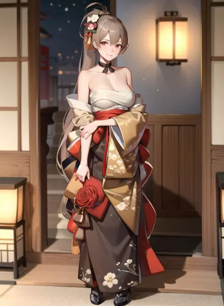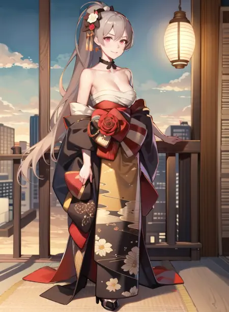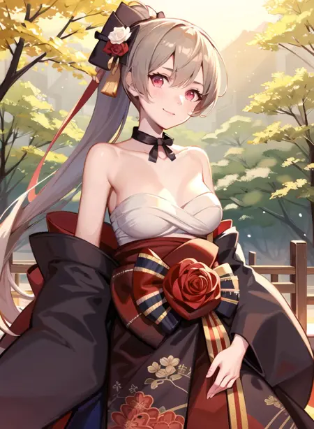 JeanBartKimono, floral_print, high_ponytail, print_kimono, black_kimono, chest_sarashi, off_shoulder, black_choker, hair_ribbon, hair_flower, hakama_skirt