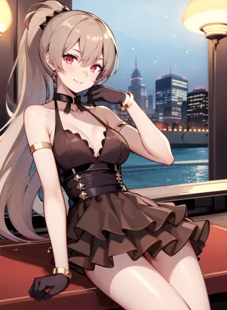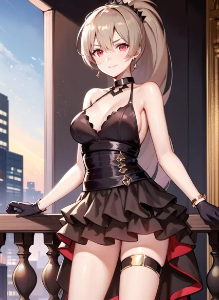 JeanBartBloodstone, black_dress, black_gloves, gold_bracelet, cocktail_dress, earrings, hair_ornament, high_ponytail, standing, thighlet, gold_choker, evening_gown, short_dress, layered_dress