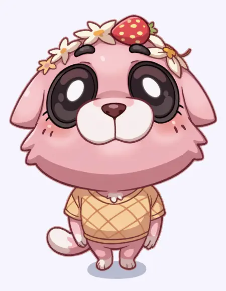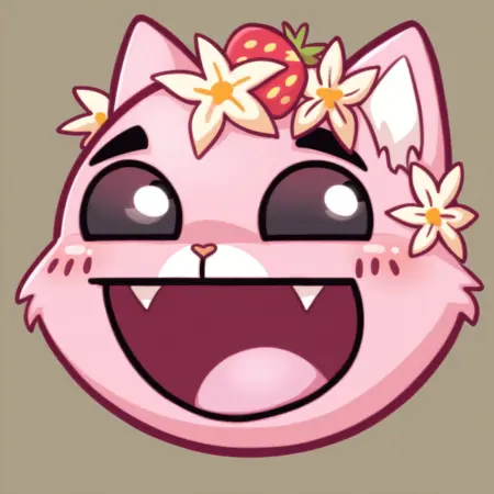 Promt: Strwbrr_Vani1ka, pink fur, anthropomorphic cat, black sclera, white eyes, white paws, black eyebrows, wears of flowers and a strawberry on their head, yellow waffle shirt.