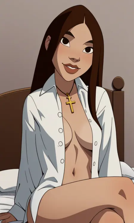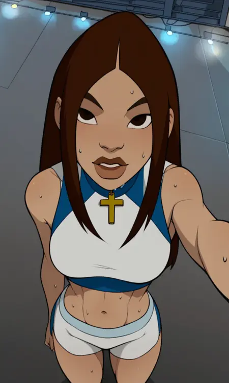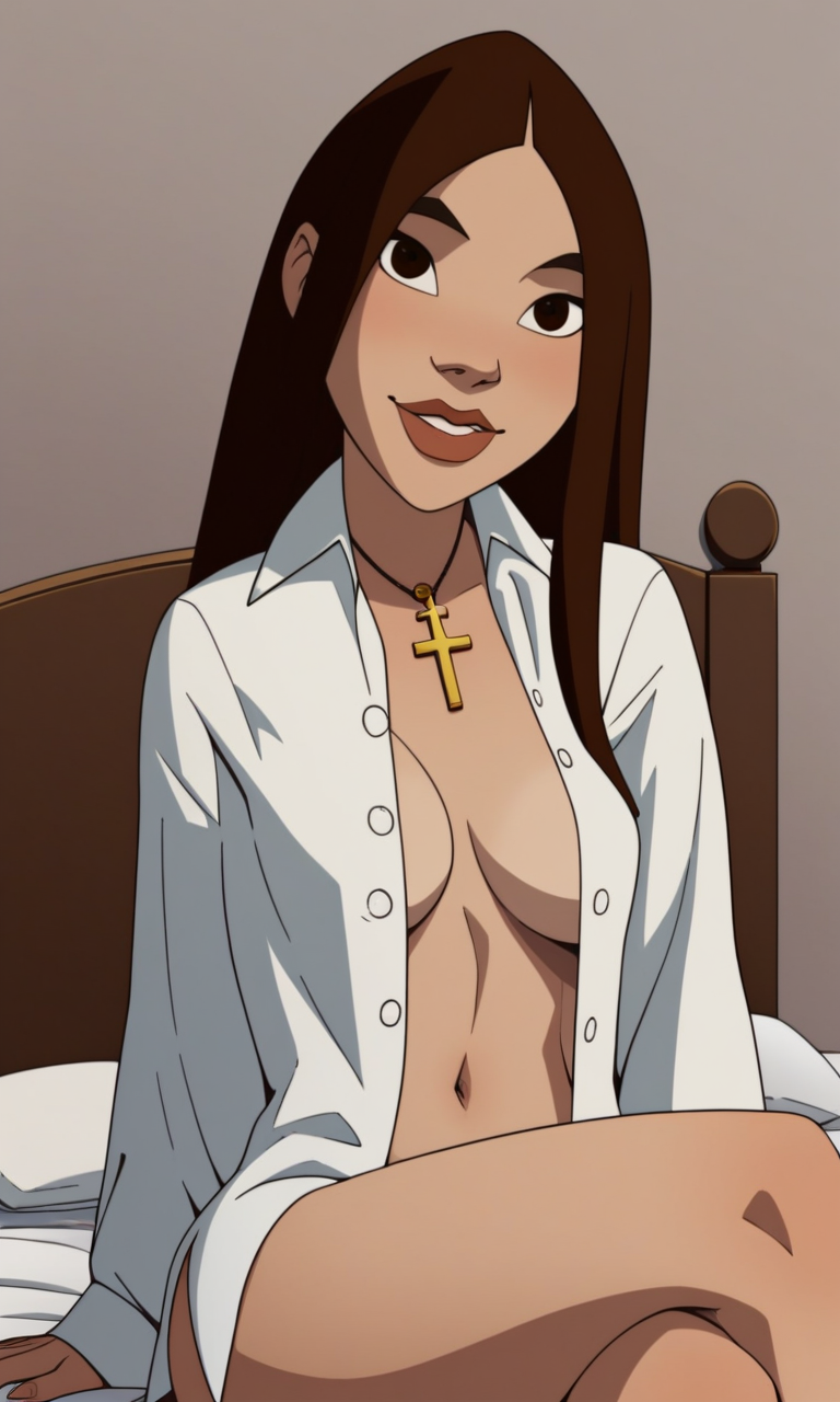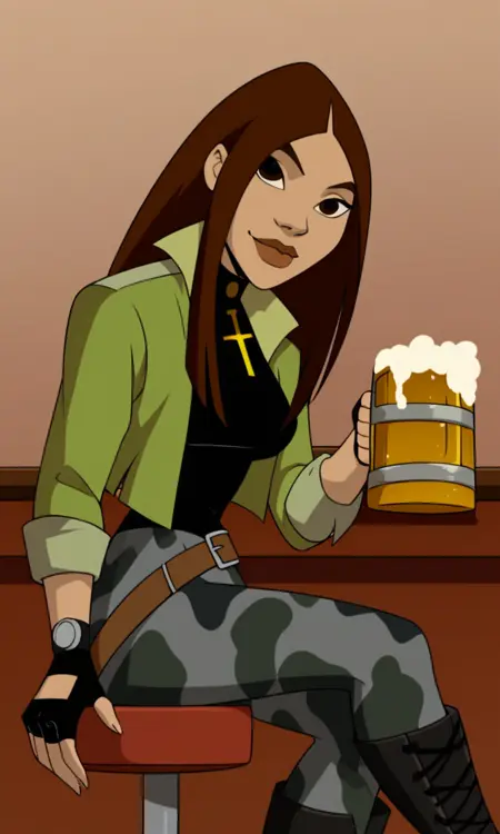 score_9,score_8_up, Liz Sherman , 1girl, solo,brown hair,long hair,cross,dark brown eyes,lips,lipstick,belt,fingerless gloves,black shirt,camo pants,black leather boots, green jacket