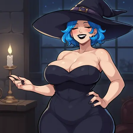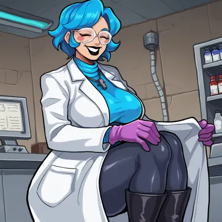 可选:蓝色头发,短发,闭眼,黑色口红,腮红贴纸,珠宝,十字架项链,高领毛衣,白色围裙,心形徽章,蓝色铅笔裙,黑色连裤袜