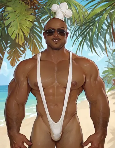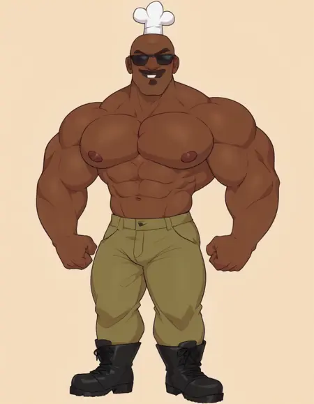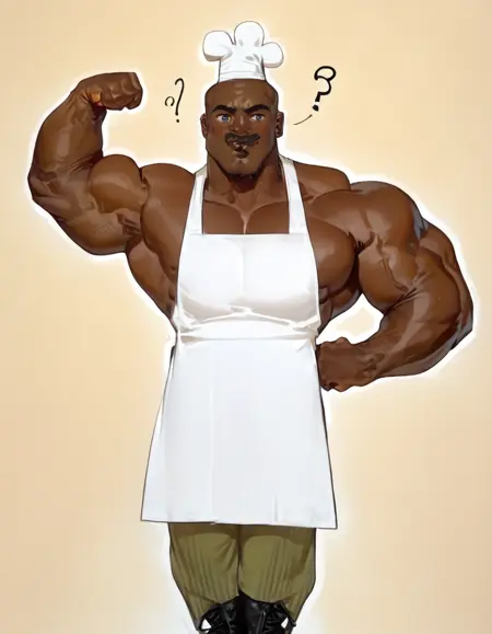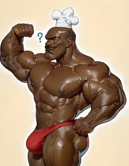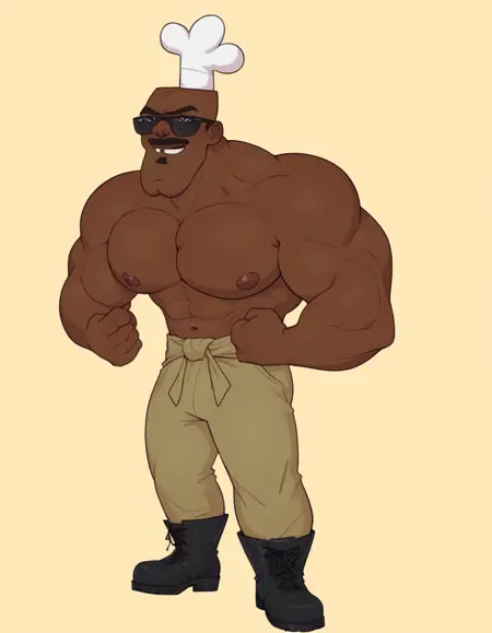 chefhatchetpxl, dark skinned man, bald, muscular, masculine, African, african american, mustache, goatee, chef hat,
