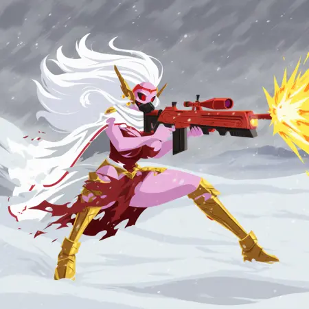 外見タグ: 色付き肌、ピンク肌、長い髪、白い髪、頭輪、赤い頭輪、黒い虹彩、色付き虹彩、赤い目、黄色いイヤリング、ポタライヤリング