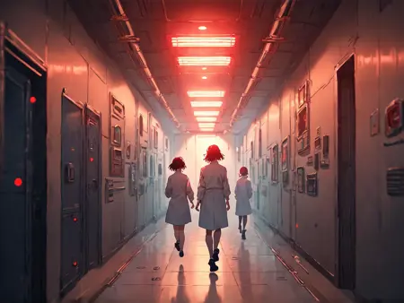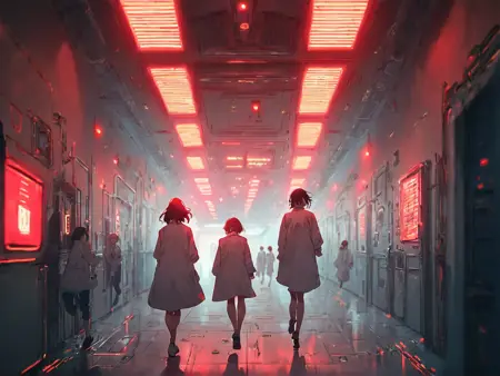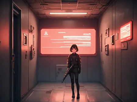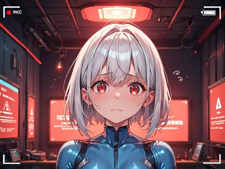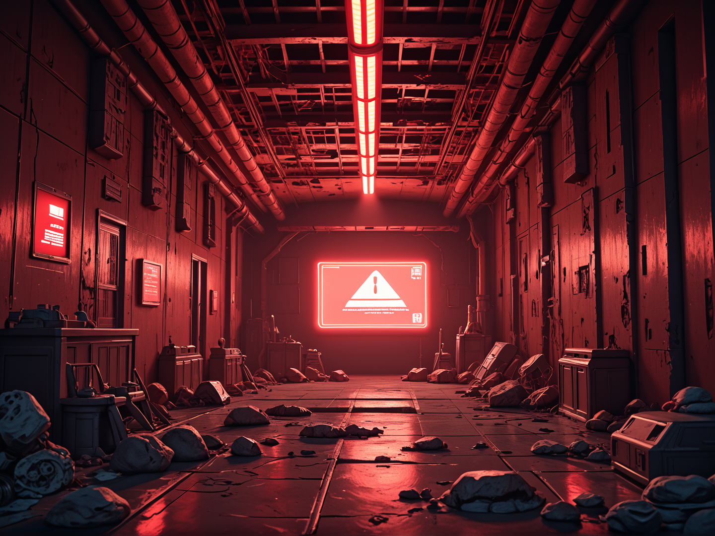 赤い非常灯と赤いエラースクリーンが赤い光を放っている