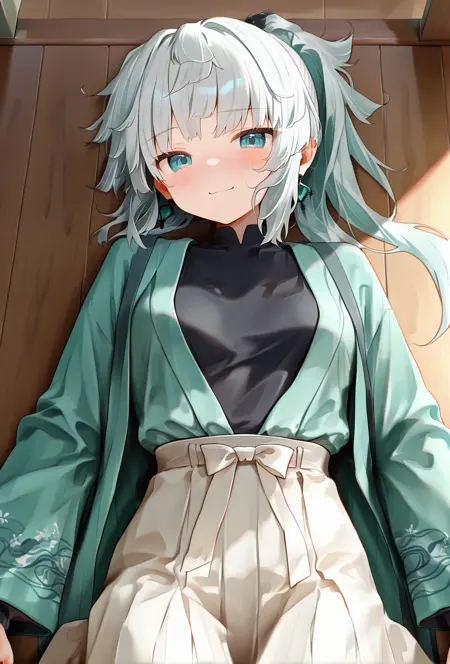示例:日本服饰,水色和服外套,敞开式外套,深蓝色衬衫,蓝色眼睛,白色裙子,袴裙,马尾,切目发,白发,宽袖,耳环