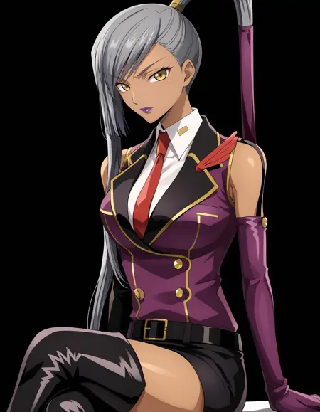 유니폼: 허벅지 부츠, 칼라 셔츠, 빨간 넥타이, 팔꿈치 장갑, 연필 스커트, 검은 벨트, 소매 없음, 단추, 흰 셔츠, 보라색 재킷
