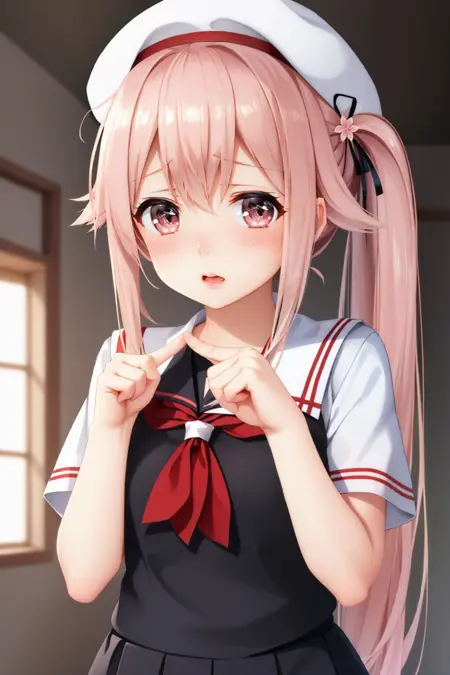 デフォルトの服装: ベレー帽, 学校制服, 黒いセラフク, プリーツスカート, 黒い手袋