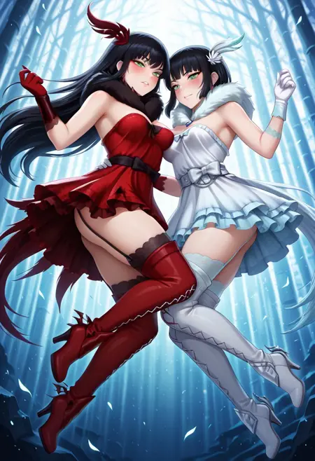 long hair, black hair, green eyes, hair ornament, long white gloves, white dress, white thigh boots, garter straps, high heels, white boa
