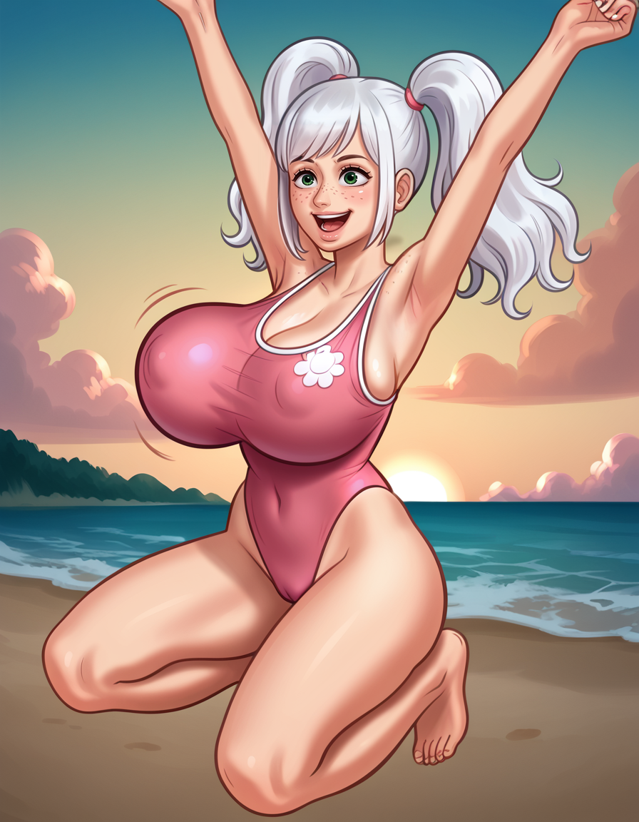 (a photo of FanoraMM:1.2), 흰 머리, 더블 테일, 긴 머리, 녹색 눈, 주근깨, 큰 가슴