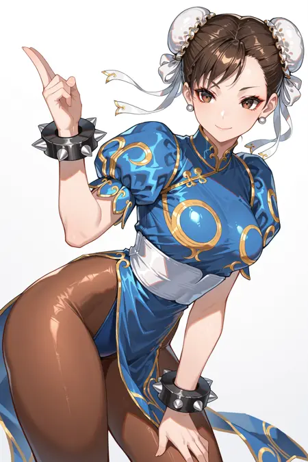 "chun-li, brown eyes, double bun, bun cover, qipao, spiked bracelet, sheer pantyhose, Blue leotard" for her default outfit.
