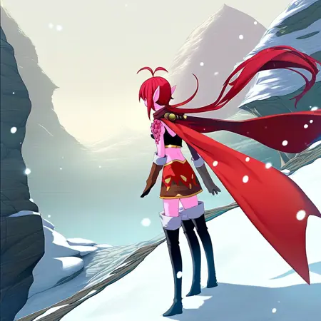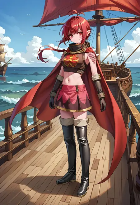 标签: Karst_GS、龙女、粉红色皮肤、面部纹饰、红眼睛、尖耳朵、红发、齐刘海、短发搭配长发缕、侧发、马尾、天线发、护喉、露肩、鳞片、尖刺、披风、红色披风、短上衣、印花衬衫、露腹、肚脐、迷你裙、印花裙、手套、肘部手套、绝对领域、大腿靴、尖头靴