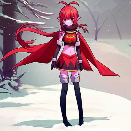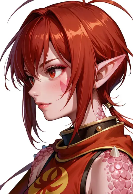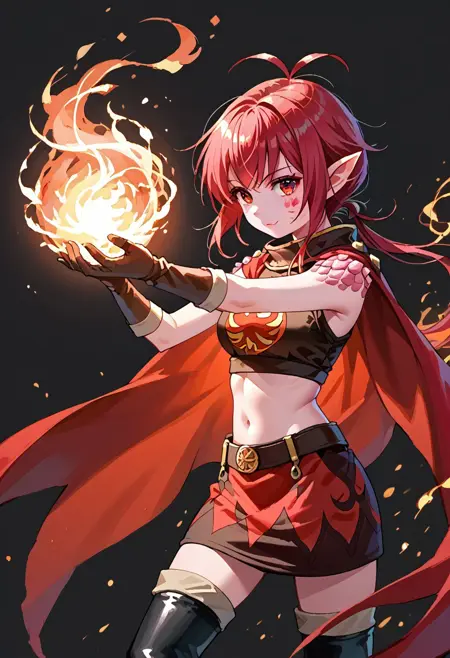 태그: Karst_GS, 드래곤 소녀, 분홍색 피부, 얼굴 무늬, 빨간 눈, 뾰족한 귀, 빨간 머리, 앞머리, 긴 머리카락이 있는 단발, 측면 머리카락, 파마머리, 안테나 머리카락, 고르겟, 어깨 노출, 비늘, 돌기, 망토, 빨간 망토, 크롭탑, 프린트 셔츠, 복부, 배꼽, 미니스커트, 프린트 스커트, 장갑, 팔꿈치 장갑, 젯타이 료이키, 허벅지 부츠, 뾰족한 부츠,