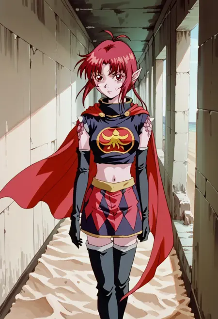 27장의 팬 아트, 1장의 다크 다운 스creenshot, 그리고 1장의 공식 아트로 학습되었습니다. 놀랍게도, 그녀를 위한 LoRA를 만드는데 충분한 팬 아트가 실제로 존재했습니다(그녀의 게임은 인기가 있었지만, 2007년 이전의 팬 아트는 중앙 저장소가 없었기 때문에 잘 보존되지 않았습니다). 망토가 둘로 나뉘어 있는 부분과 비늘로 된 어깨는 이상했습니다. 얼굴 무늬는 제대로 학습되지 않았는데, 이는 팬 아트들이 이를 일관되게 그리지 않았고, 무늬가 흐릿했기 때문이라고 생각합니다.