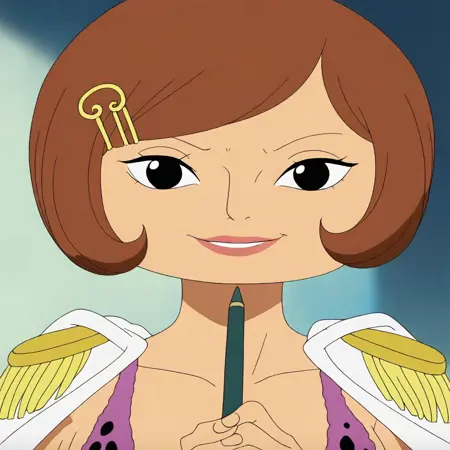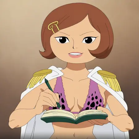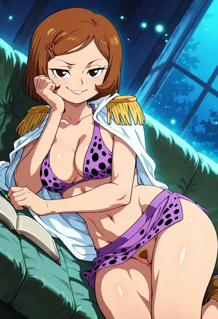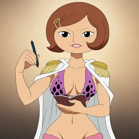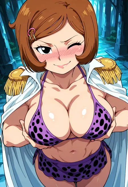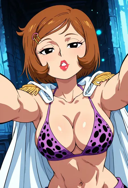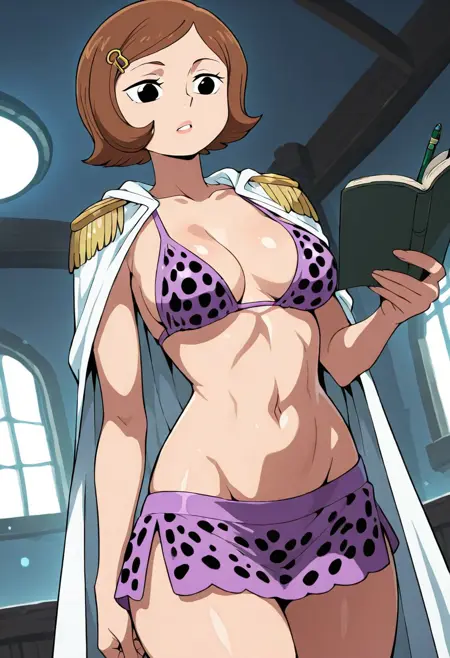 NerineOP, 1girl, solo, brown hair, short hair, hair clip, black eyes, lips, wide head, white cape, epaulettes, cleavage, large breast, bikini, bikini top only, short skirt, shoes, purple clothes, polka dot bikini, polka dot skirt, navel, midriff, groin, collarbone, notebook, pen, takes memos,