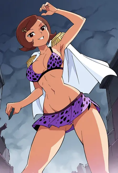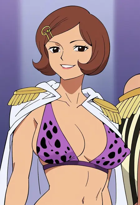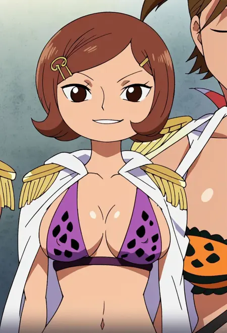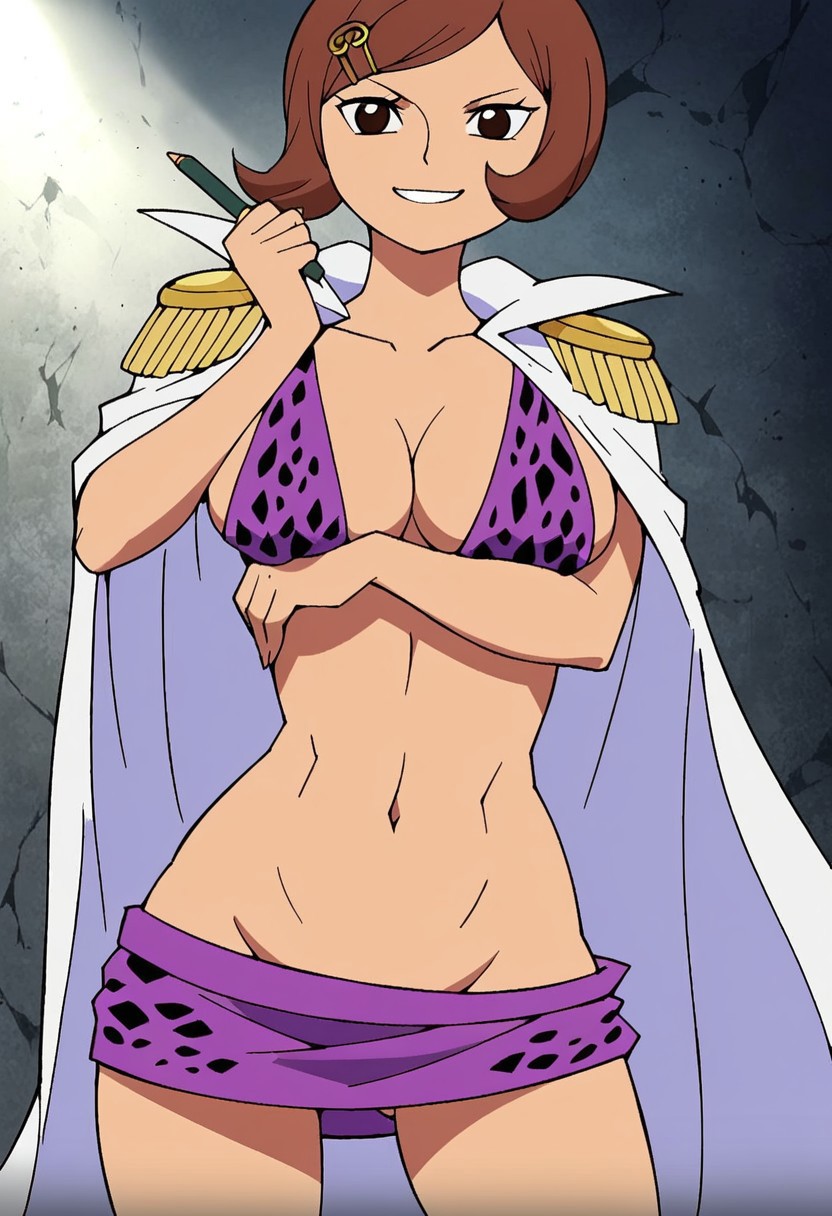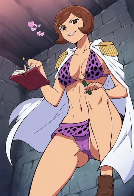 NerineOP, 1girl, solo, brown hair, short hair, hair clip, black eyes, lips, wide head, white cape, epaulettes, cleavage, large breast, bikini, bikini top only, short skirt, shoes, purple clothes, polka dot bikini, polka dot skirt, navel, midriff, groin, collarbone, notebook, pen, takes memos,