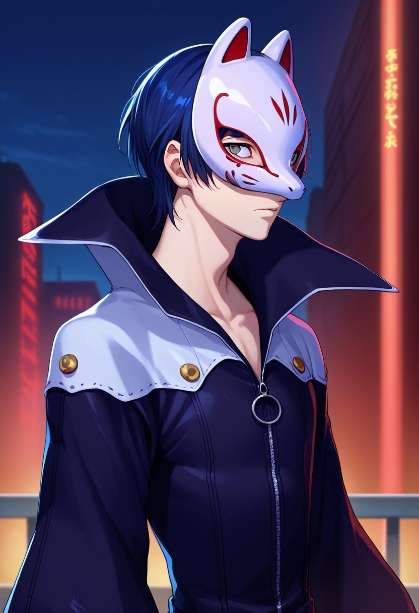 yusuke, 1boy, male focus, solo, grey eyes, blue hair, short hair, thief outfit, mask, fox mask, jacket, black jacket, high collar, long sleeves, gloves, blue gloves, zipper, pants, black pants, tail, fox tail, boots, white footwear,