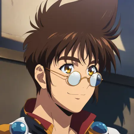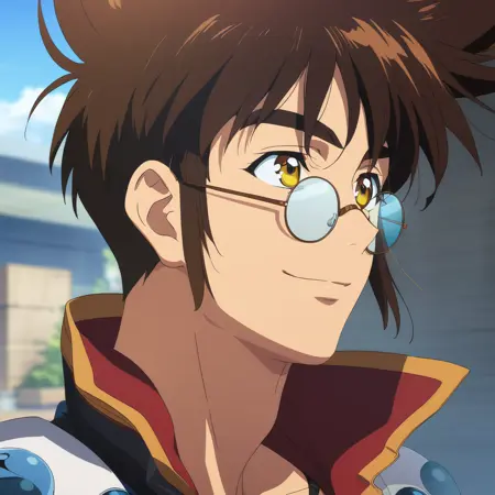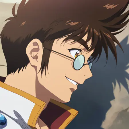 コンバインド・ブールスタイル。アクティベーションタグは「nekki_basara, 1boy, solo, brown hair, yellow eyes, glasses, white shirt, black jacket, white jeans」です。