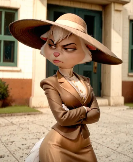 갈색 정장, 톤 스커트 - 일상적인 사무복으로, 영화 초반에 쓰는 모자를 추가하려면 **넓은 모자 끝**을 추가하세요.