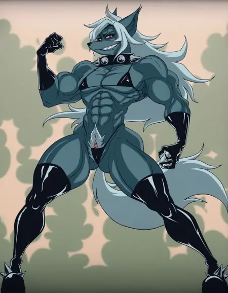 강화 태그: 근육질의 여자, 늑대, 평평한 가슴, 붉은 눈, 날카로운 목걸이, 검은 마이크로 비키니, 라텍스 장갑, 라텍스 부츠