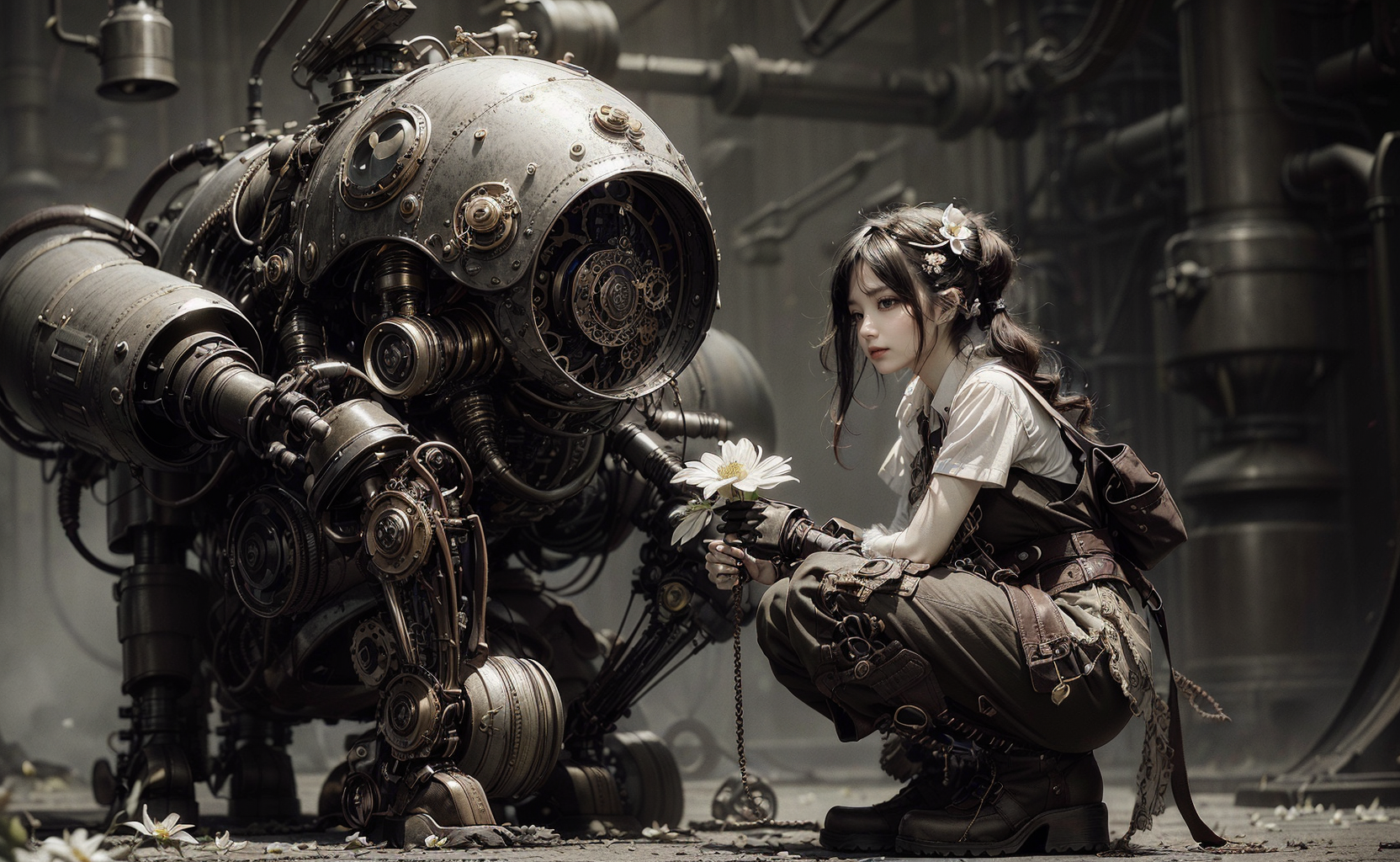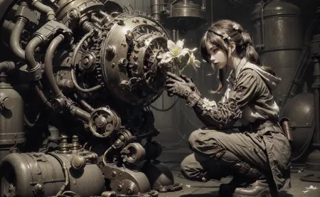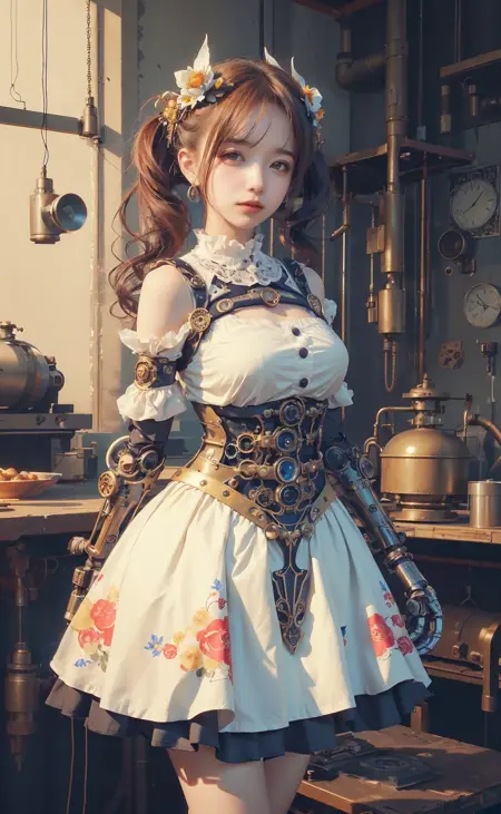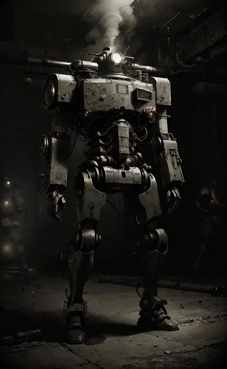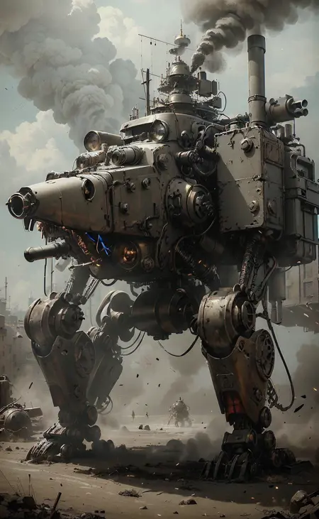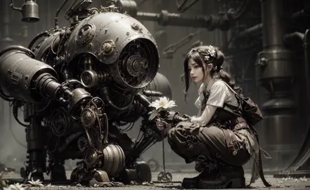 이 모델에서는 '기계식 팔'과 같은 '기계화된' 단어를 사용하여 캐릭터에 더 나은 스팀펑크의 의체 감각을 부여하거나, 스팀펑크 로봇을 제작할 수 있습니다. 관련된 모든 단어를 시도해 볼 수 있으며, 기본 트리거 단어로는 steampunk를 사용할 수 있습니다.