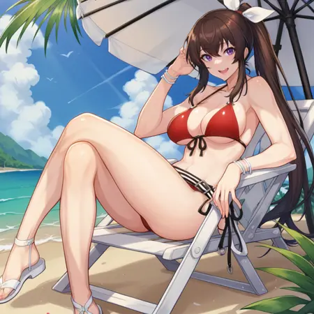 CS_Swm, bead bracelet, striped belt, loose belt, red bikini, halterneck, cleavage, hair ribbon, white ribbon, string bikini, navel,