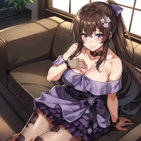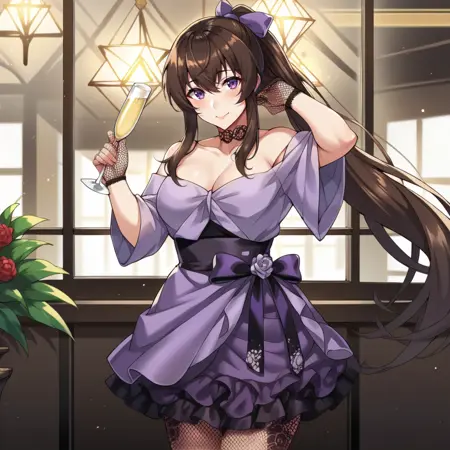 Mina, high ponytail, brown hair, purple eyes, long hair,
