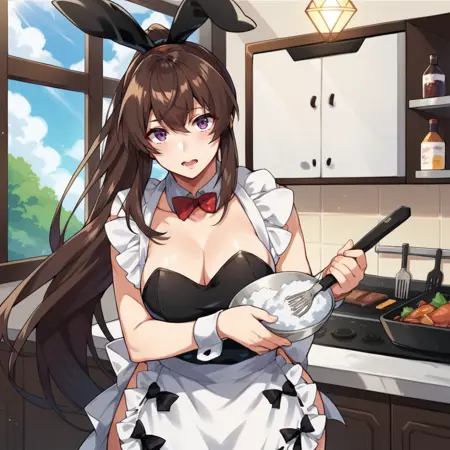 CS_Maid, black leotard, white apron, frilled apron, black bow, bunny ears, detached collar, red bowtie, cleavage, wrist cuffs, double breasted, strapless leotard, maid apron,