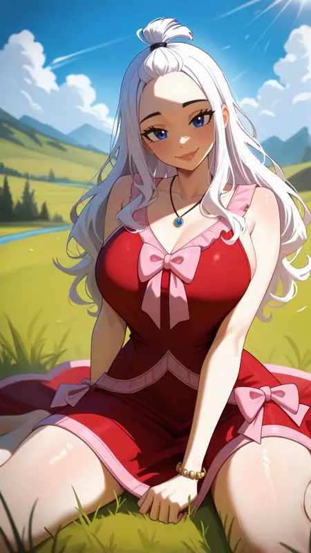 DEF: mirajanedef, blue eyes, white hair, top knot, forehead, long hair, red dress, pink trim, pink bow, sleeveless dress, jewelry, necklace, bracelet,