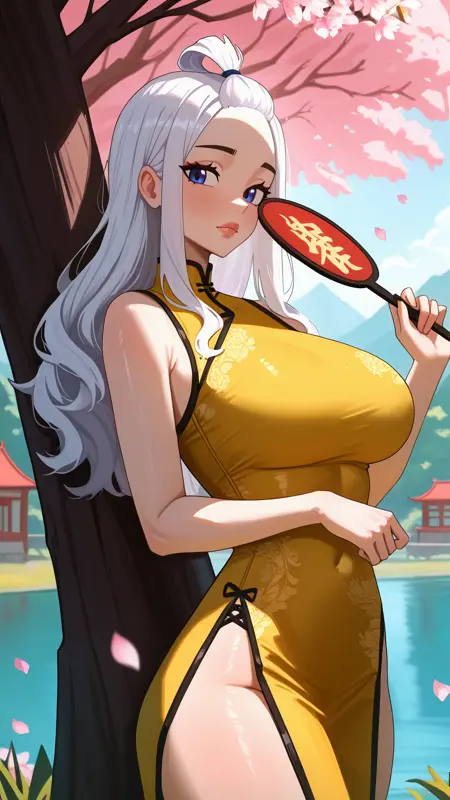 China dress: mirajanedef, blue eyes, white hair, top knot, forehead, long hair, sleeveless dress, china dress, yellow dress, turtleneck, sideslit,