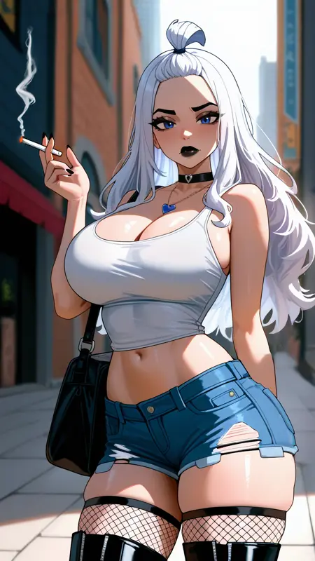 mirajalegria, blue eyes, white hair, ponytail, headband, long hair, pointy ears, black bodysuit, see-through bodysuit, clothing cutout, lipstick, skin tight, gauntlets, demon wings, white trim,