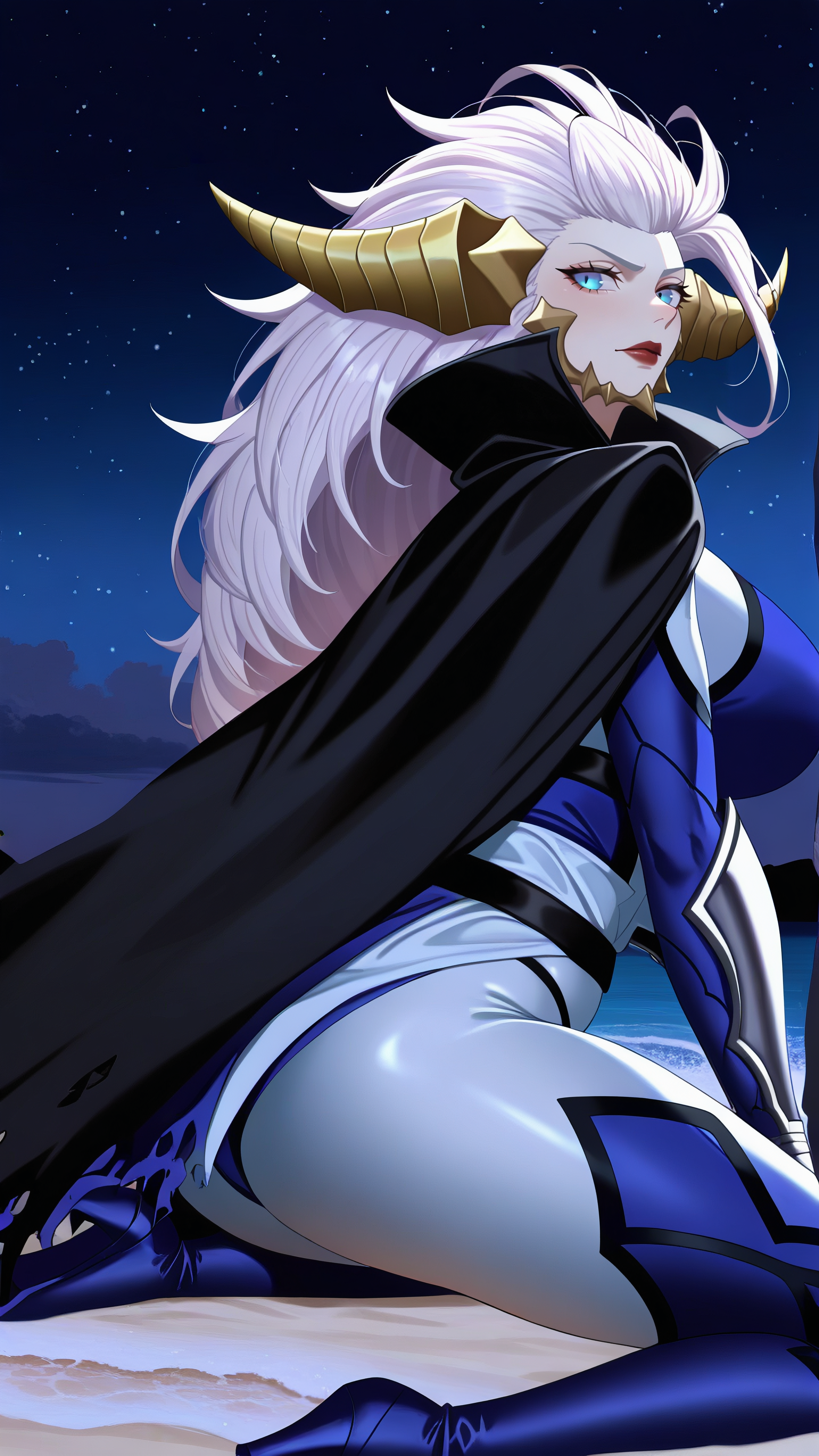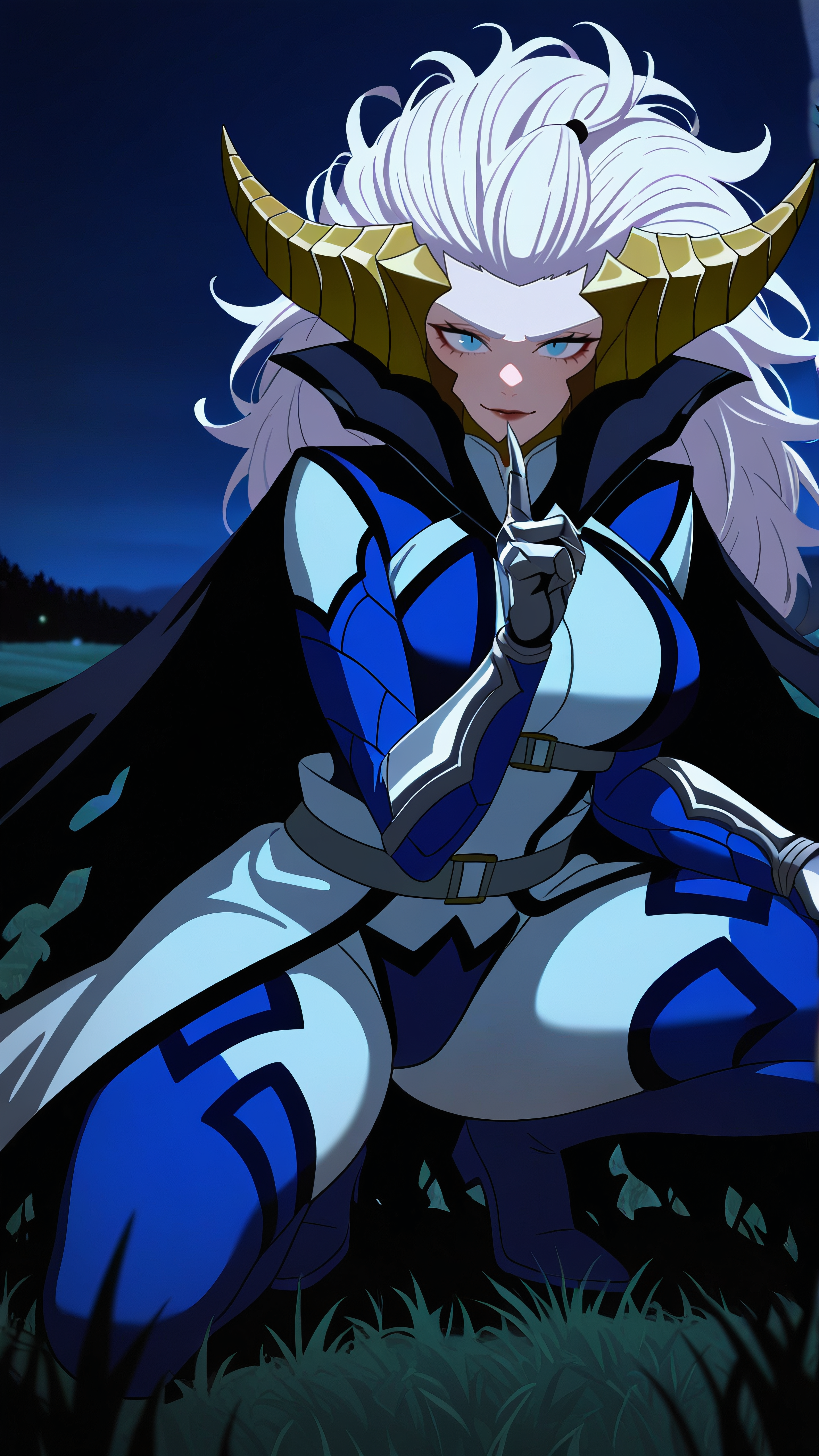 mirajsitri, blue eyes, white hair, long hair, demon horns, yellow horns, lipstick, two-tone bodysuit, clawed gauntlets, silver gauntlets, high collar, torn cape, grey belts, waist cape, dragon girl, blue footwear,