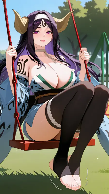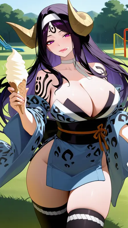 mirajseilah, 보라색 눈, 검은 머리, 긴 머리, 하얀 머리띠, 이마 문신, 얼굴 문신, 초커, 뿔, 문신, 일본 복장, 짧은 킴ono, 야생동물 무늬, 검은 허벅지 스타킹, 분리된 소매, 넓은 소매, 오비, 끈, 발가락 없는 하의,