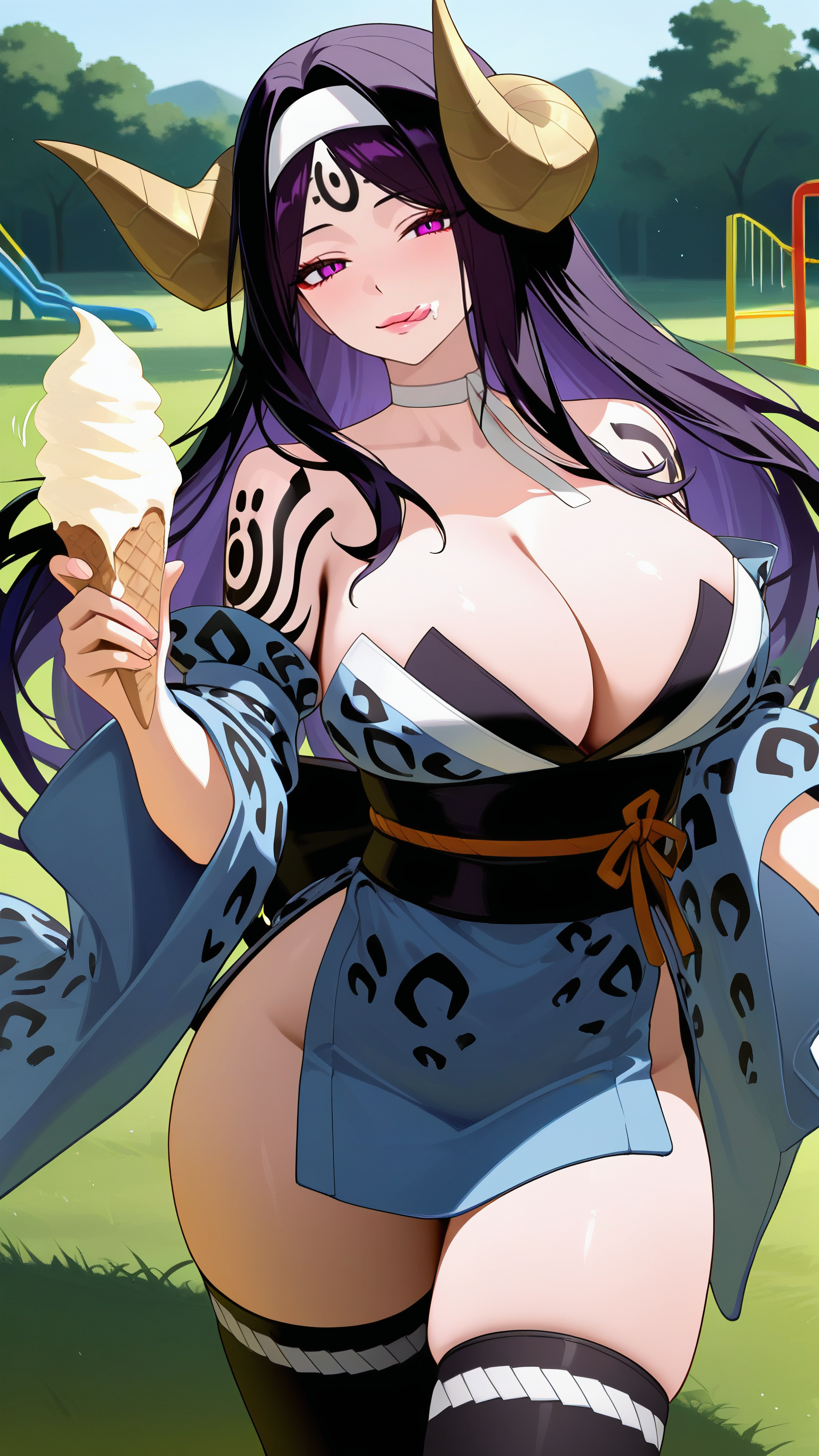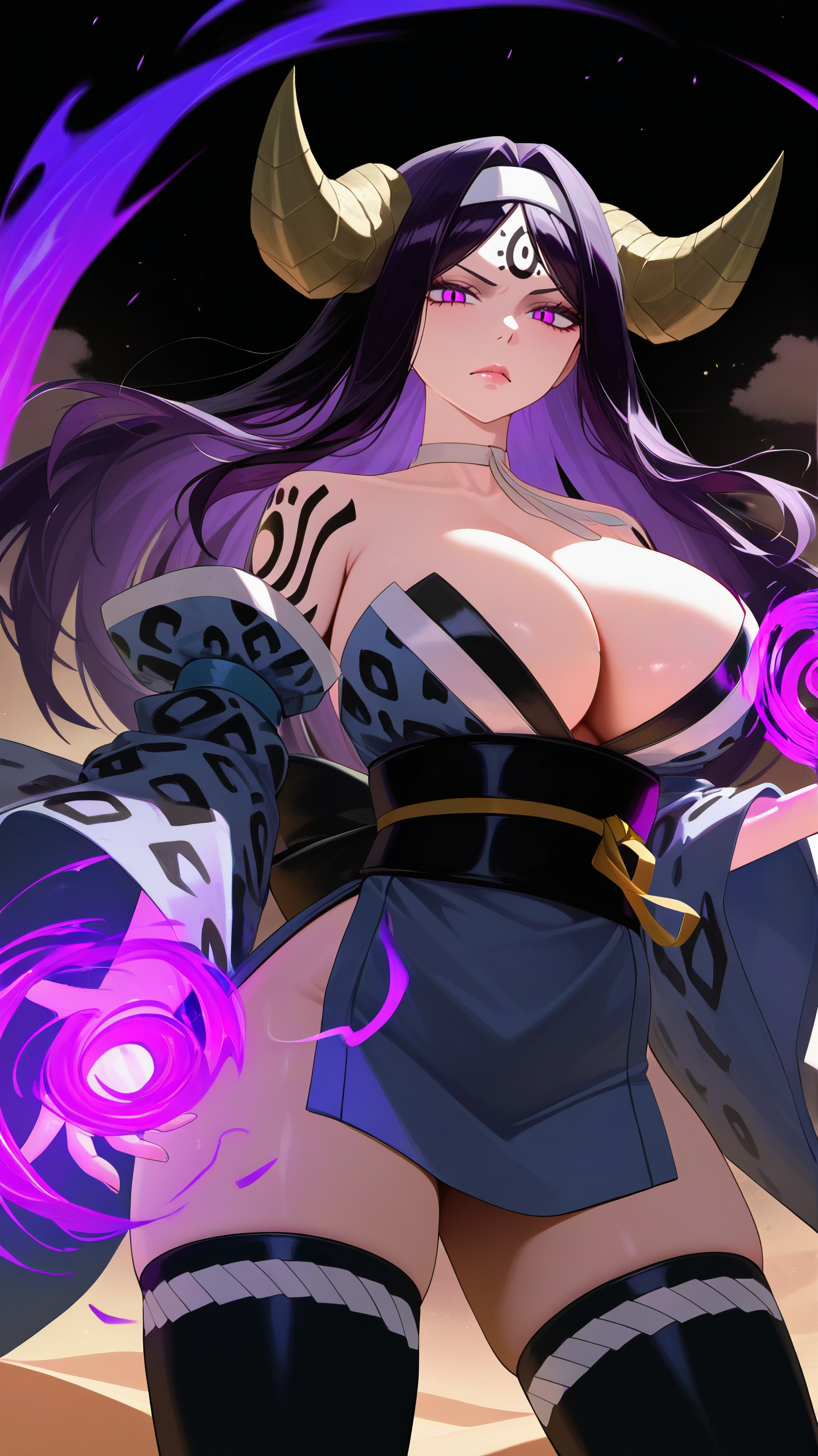 mirajseilah, 紫色眼睛, 黑色头发, 长发, 白色发带, 额头纹饰, 面部纹饰, 项圈, 角, 纹身, 和服, 短款和服, 动物纹, 黑色过膝靴, 分离袖子, 宽袖, 腰带, 丝带, 无趾袜,