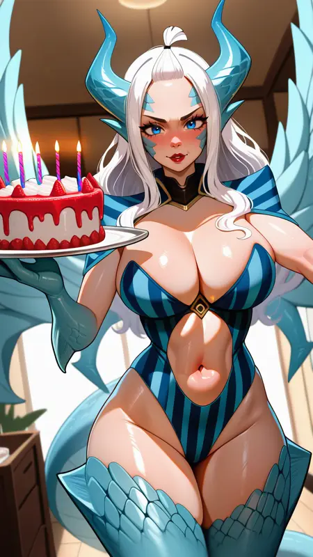 mirajhalphas, 蓝色眼睛, 白色头发, 长发, 怪物女孩, 龙尾, 龙角, 鳞片, 爪子, 蓝色紧身衣, 条纹紧身衣, 服装镂空, 肚脐镂空, 肚脐, 红色口红, 羽翼, 大腿靴, 蓝色鞋履,