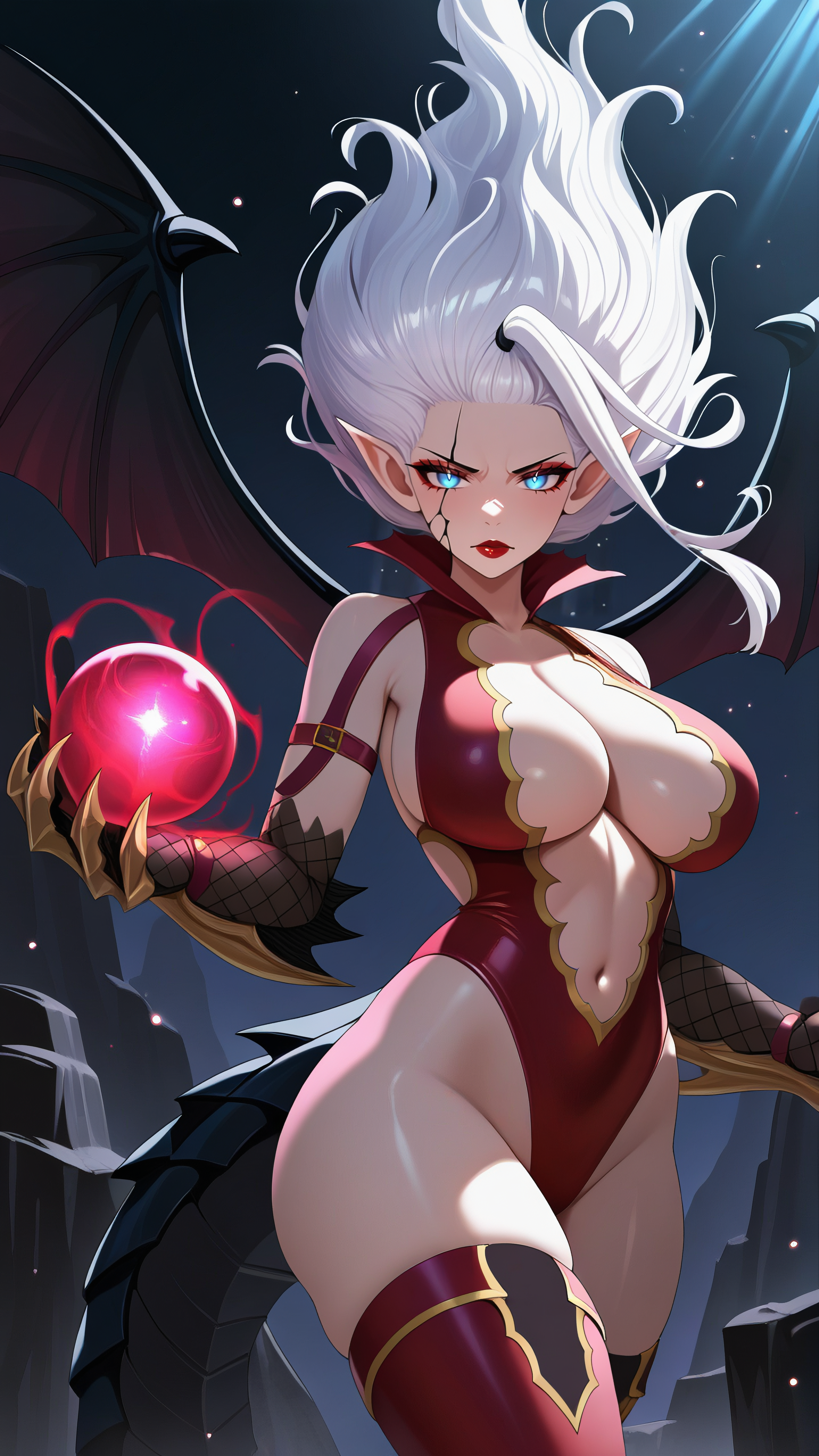 mirajsatansoul, 蓝色眼睛, 白色头发, 漂浮头发, 长发, 怪物女孩, 尖耳朵, 面部纹饰, 蝙蝠翅膀, 爪式手套, 装甲手套, 网状手套, 红唇, 龙尾, 恶魔之翼, 红色紧身衣, 中间开口, 红色过膝靴, 肩带,