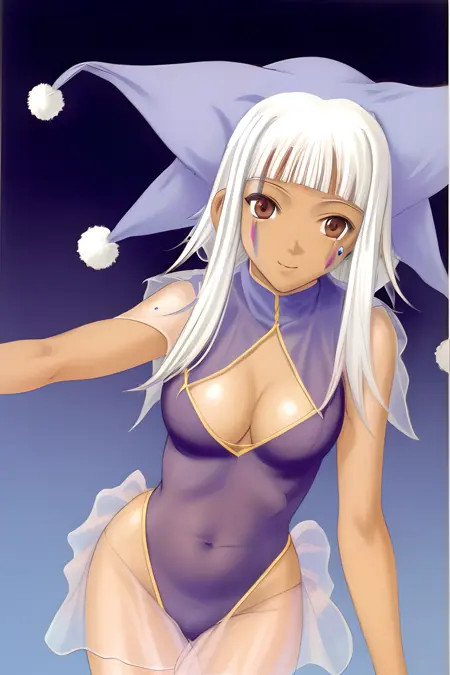 저는 자지의 클로운 복장을 묘사할 때 다음 프롬프트를 사용했습니다: jester cap, 투명한, 허리 노출, 레오타드