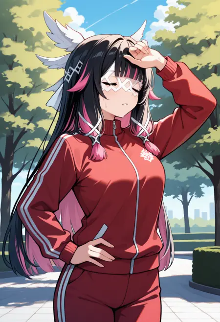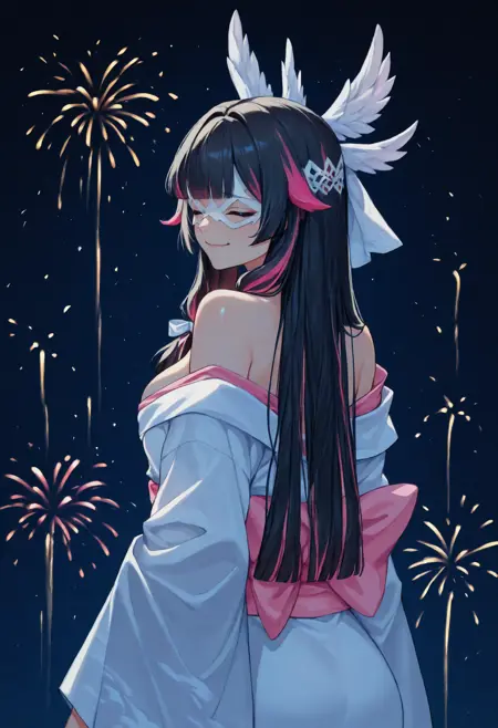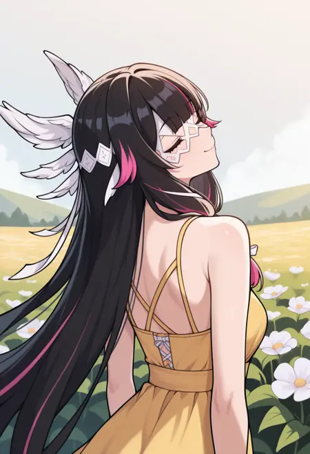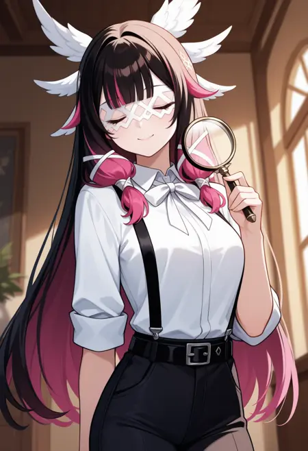 Trigger + Appearance: c0lumbina, long hair, streaked hair, black hair, pink hair, blunt bangs, hair ribbon, white ribbon, head wings, closed eyes