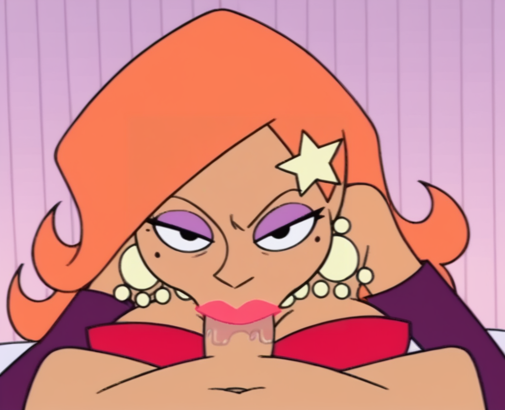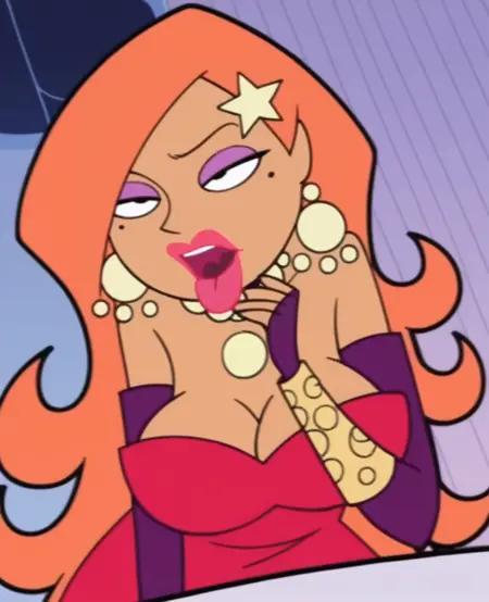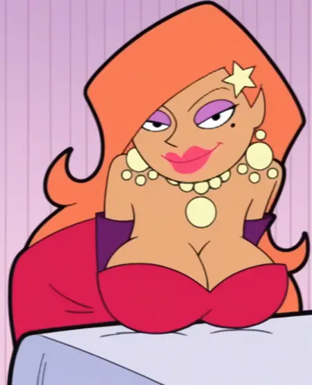 jrmb, long hair, large breasts, cleavage, black eyes, earrings, elbow gloves, necklace, mole under eye, eyeshadow, star hair ornament, orange hair, red dress, strapless, pink lips, bracelet, high heels,