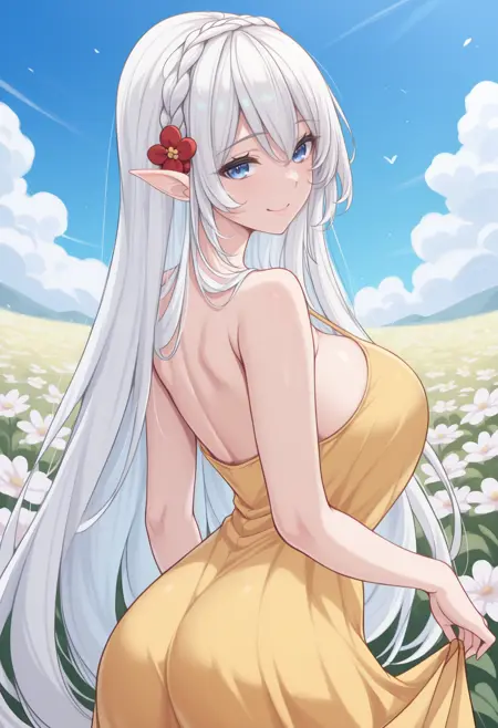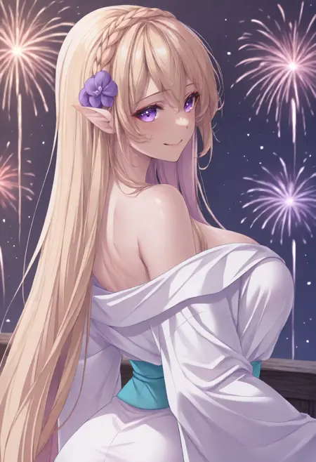 触发词 + 外貌: ku0n a0e, 长发, <棕色、金色、白色> 发色, 发丝遮眼, 王冠编发, 头饰, 尖耳, <绿色、紫色、蓝色> 眼睛, 大胸