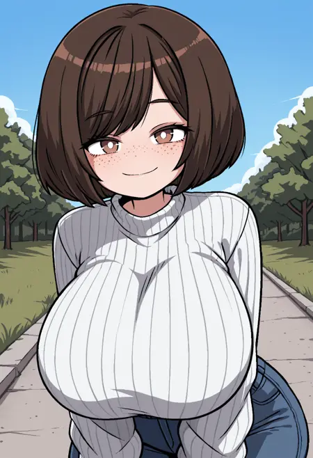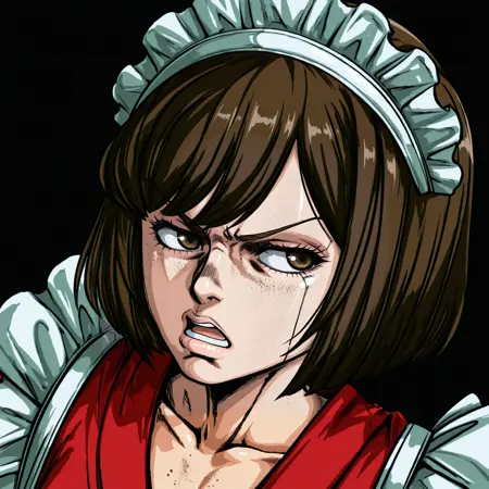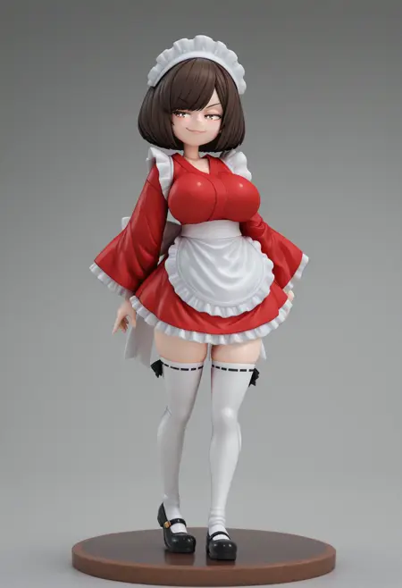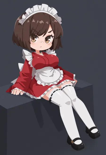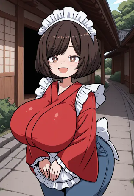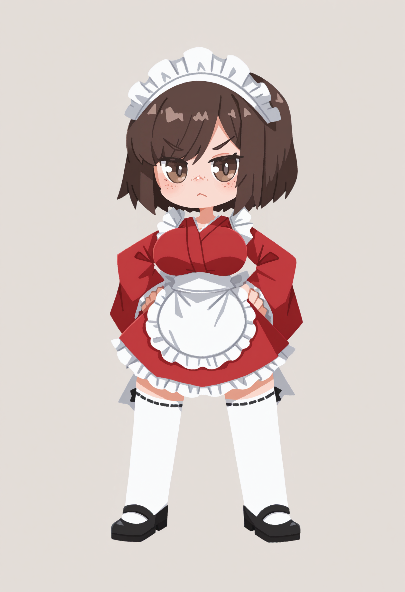 t1lde, 1girl, freckles, red kimono, red wa maid, brown eyes, bob cut, swept bangs, brown hair, maid headdress, white thighhighs, waist apron, wide sleeves, large breasts