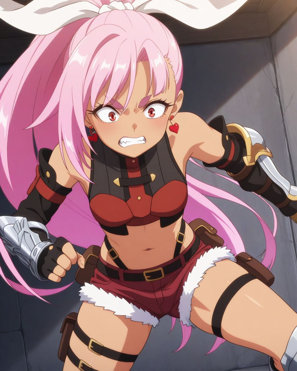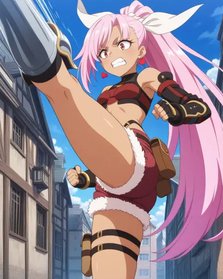 ベースの服装: アニメ色調、ryizu、1人女の子、黒肌、ピンク髪、長い髪、赤い目、濃い眉、片側の前髪、ハート型のイヤリング、ポニーテール、リボン、チューブトップ、肩出し、袖なし、フィンガーレスグローブ、片手のガントレット、へそ、赤いショートパンツ、デニムショートパンツ、ファー trimming、ベルト、ストラップ、ポーチ、太ももハーネス、ガーブ