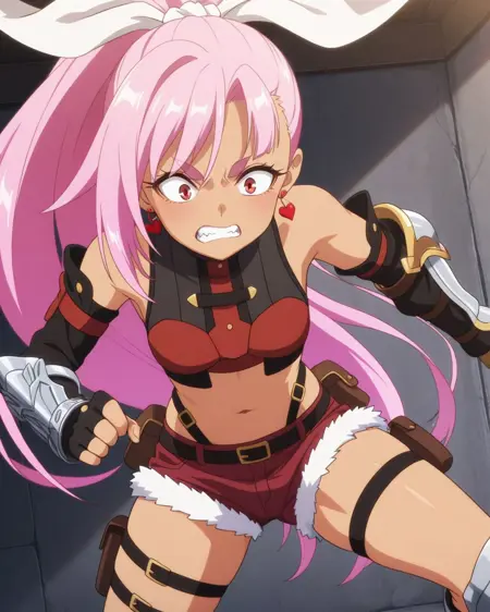 기본 옷차림: 애니메이션 컬러링, ryizu, 1소녀, 짙은 피부, 분홍색 머리, 긴 머리, 빨간 눈, 두꺼운 눈썹, 한쪽 옆머리, 심장 모양 귀걸이, 꼬리머리, 리본, 튜브 탑, 어깨 노출, 분리된 소매, 손가락 없는 장갑, 한쪽 갑옷, 배꼽, 빨간 반바지, 청바지, 털 장식, 벨트, 스트랩, 주머니, 허벅지 홀스터, 종아리 보호대,