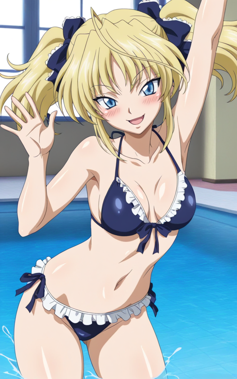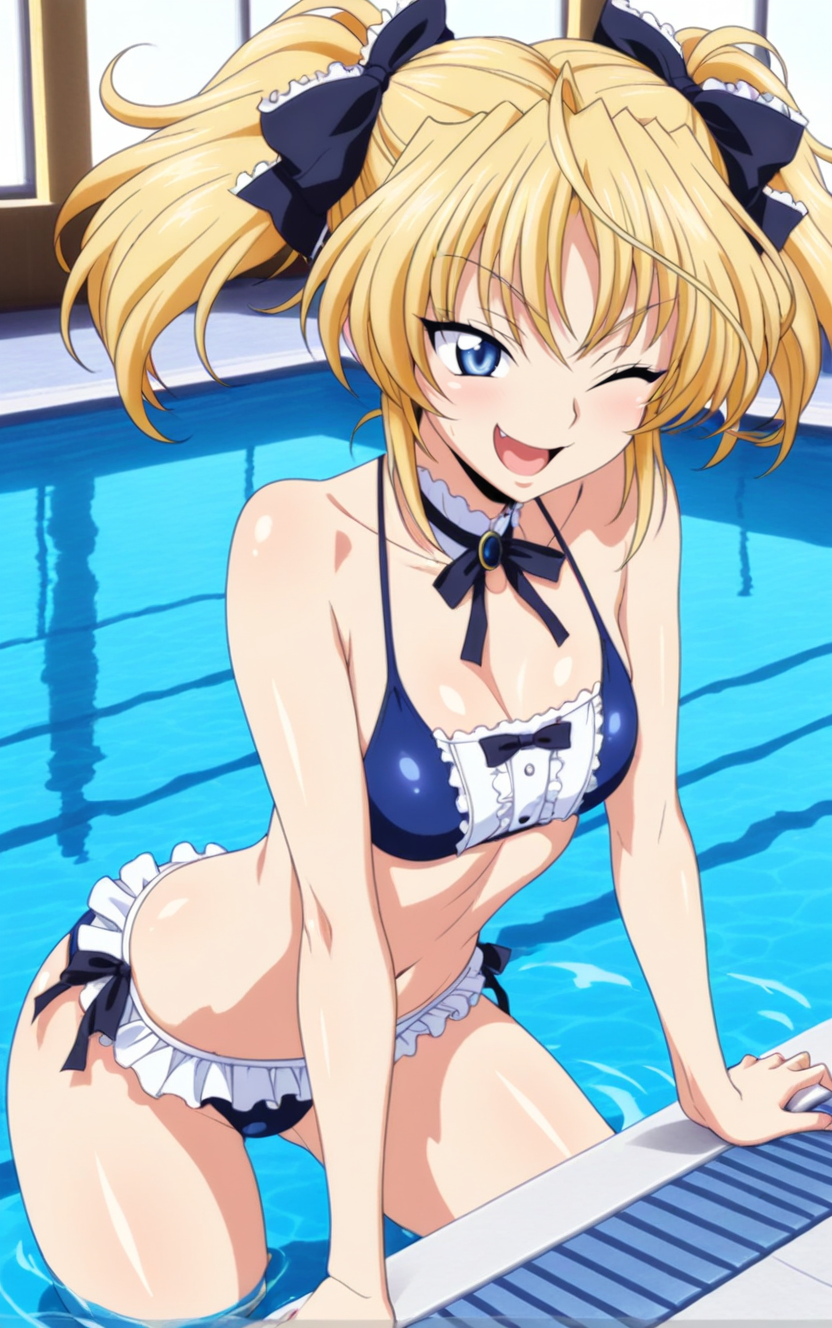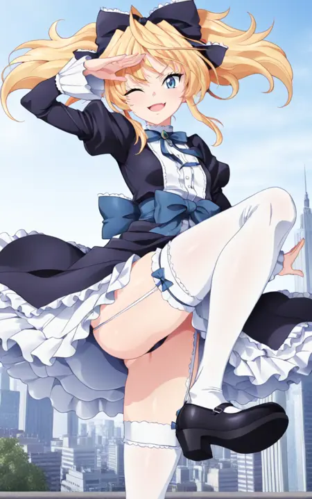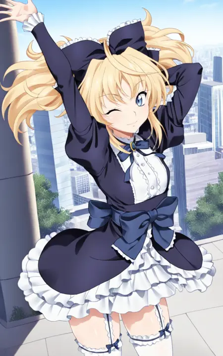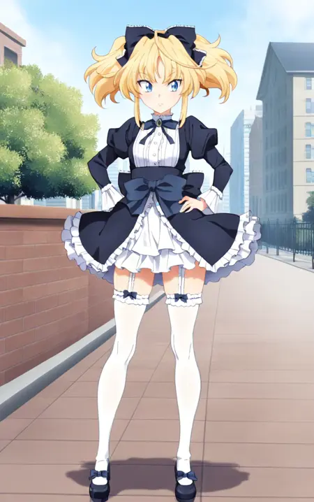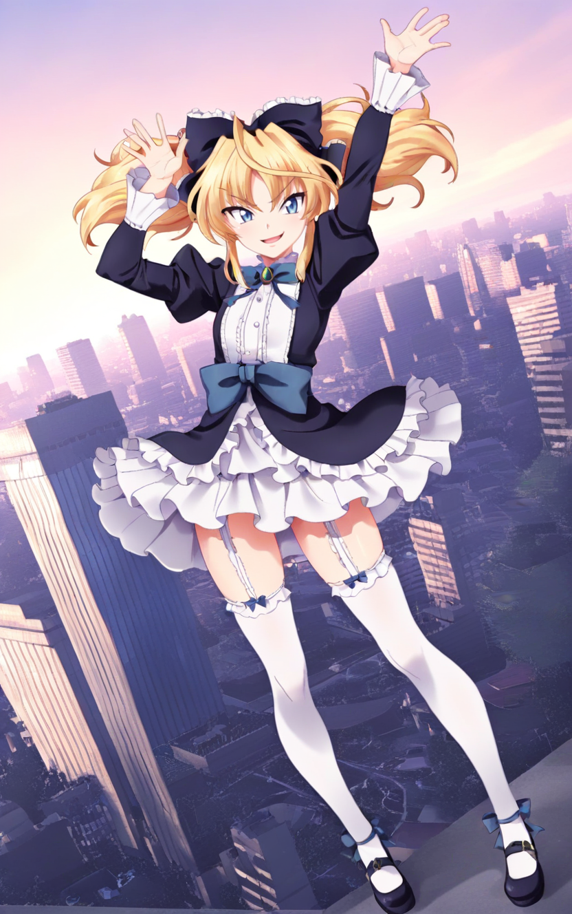 1girl,highschoolddmittelt,solo,twintails,blonde hair,blue eyes,thighhighs, garter straps, bow, hair bow, skirt, puffy sleeves,long_sleeves,frilled dress,black dress,best quality,masterpiece,sensitive, lora:HighSchoolDDMitteltNoobai075:1