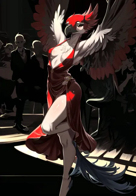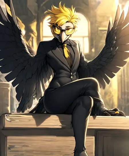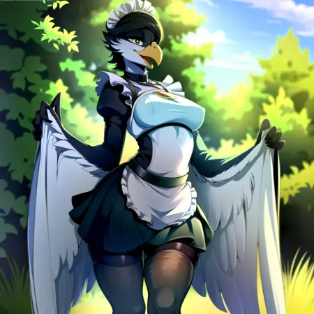 v1.3.2: 여성과 남성을 모두 표현할 수 있습니다. "winged-arms" 태그를 사용하면 날개 팔이 나옵니다. 기타 좋은 태그로는 bird, avian, tail feathers, beak, 기타 새의 특징들이 있습니다.