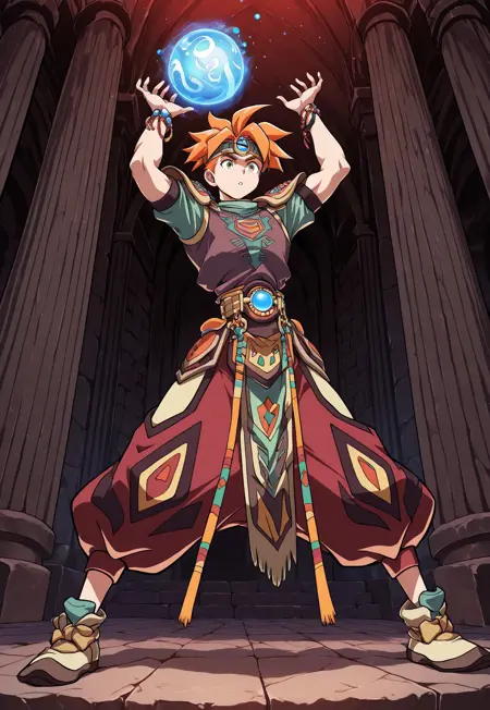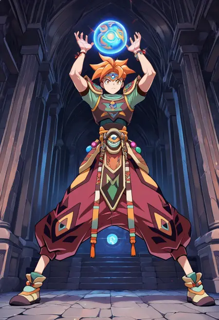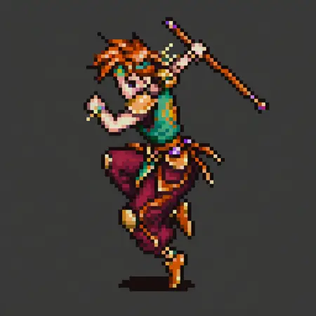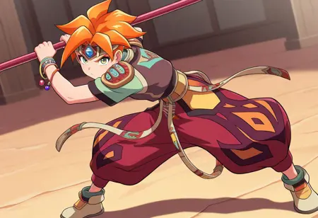spiky orange hair, pauldrons with faces, jeweled headband, print shirt, green sleeves, bracelets, belt with dangling straps, red baggy pants, shoes, holding bo staff