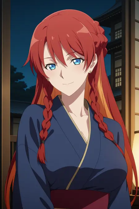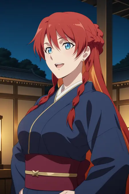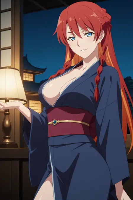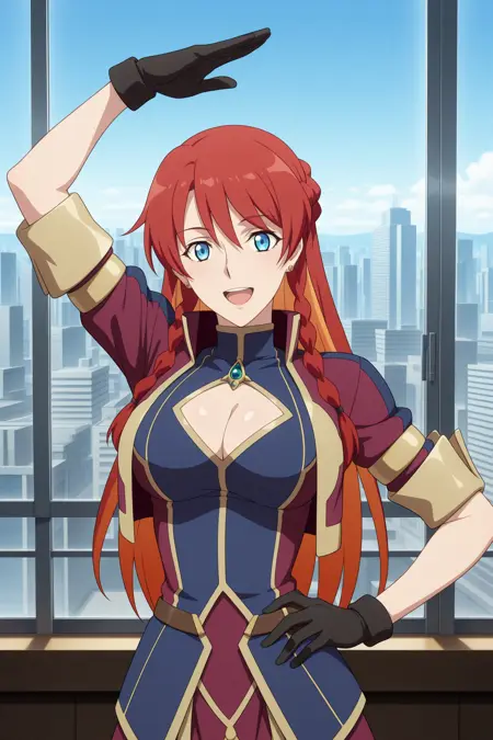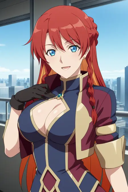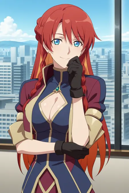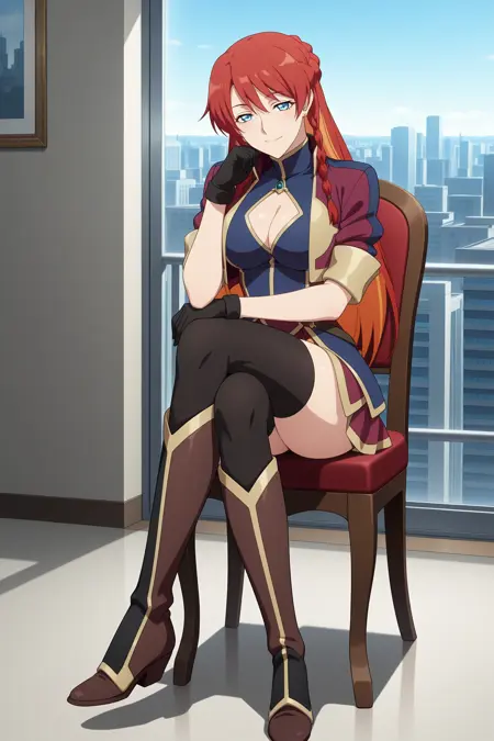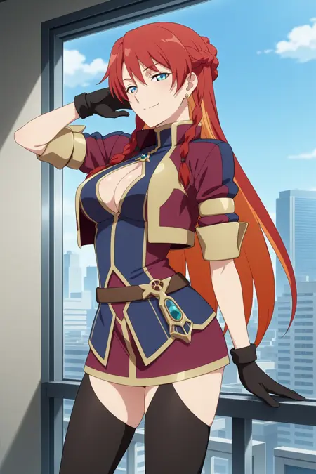 selesia upitiria, orange hair, long hair, twin braids, hair bun, blue eyes, earrings, jacket, cropped jacket, open jacket, short sleeves, black gloves, blue dress, brooch, cleavage, cleavage cutout, clothing cutout, red skirt, black thighhighs, brown footwear, knee boots