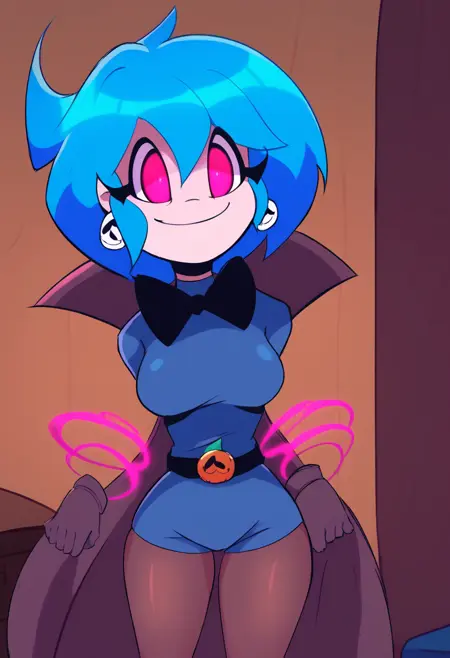 droopy, 青い髪, ピンクの目, 浮いている手, パンティーストッキング, ベルト, ブーツ, ケープ, 茶色の手袋, ボウタイ, 頭蓋骨のイヤリング