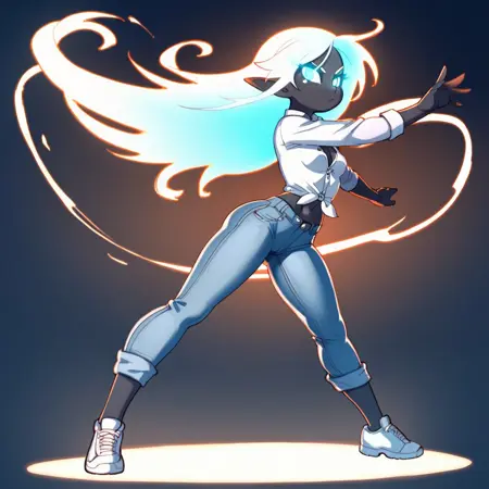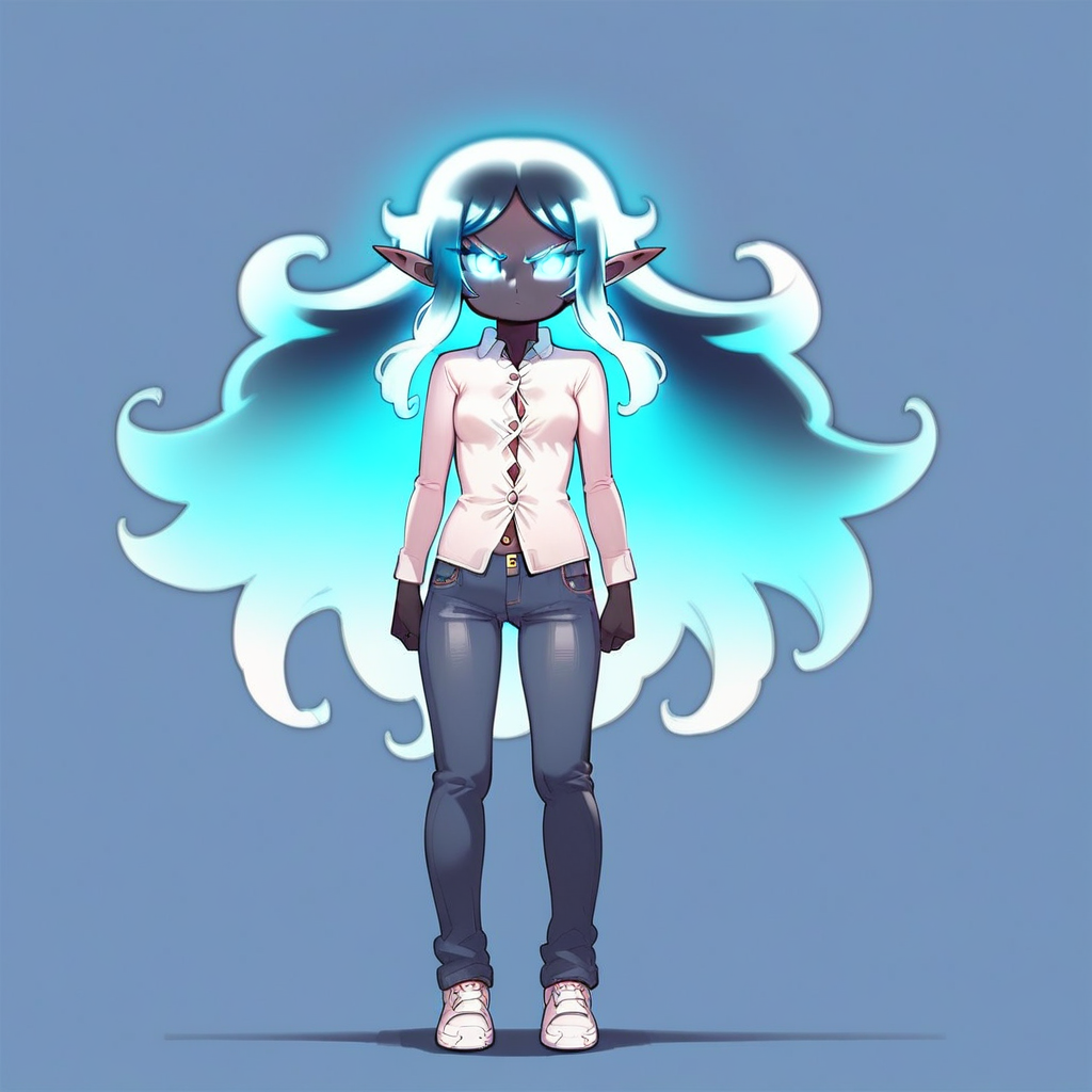 black elf, black skin, black eyes, 1girl, long hair, blue glowing , small body, white office shirt, jeans, serious fsce, anime,